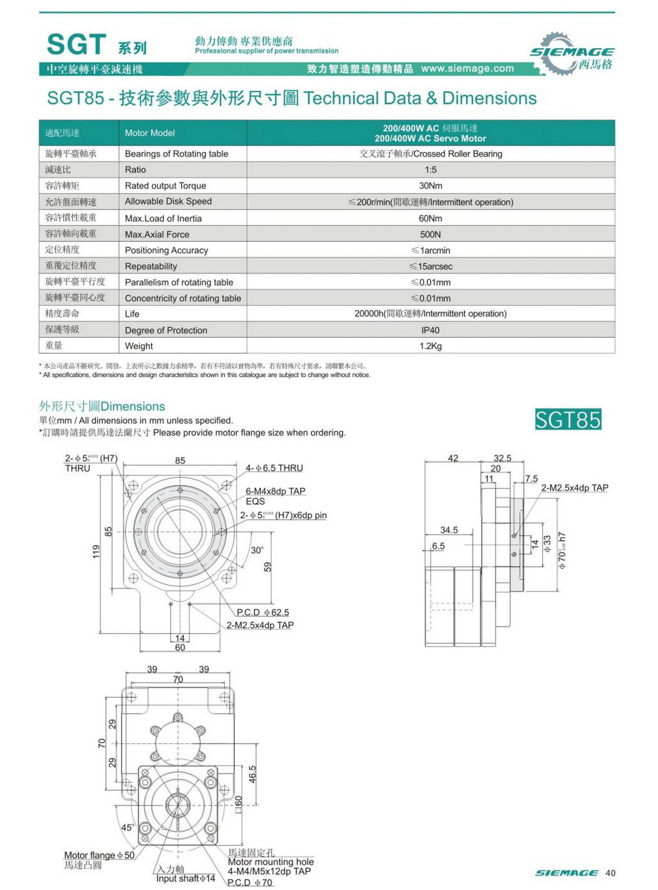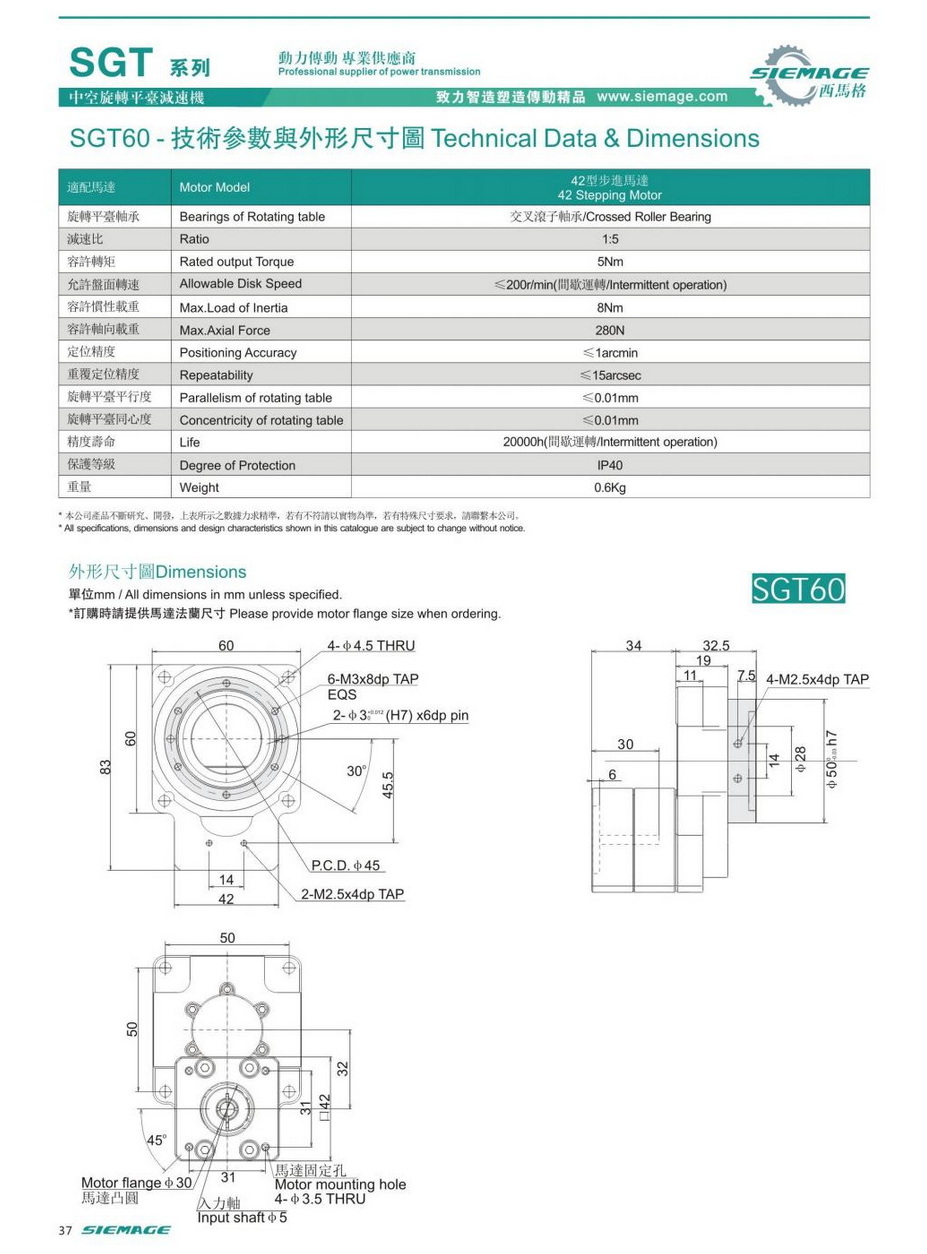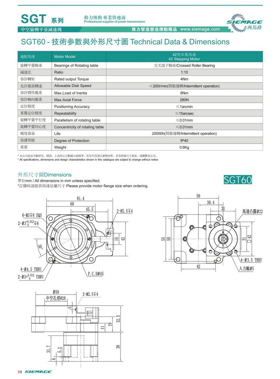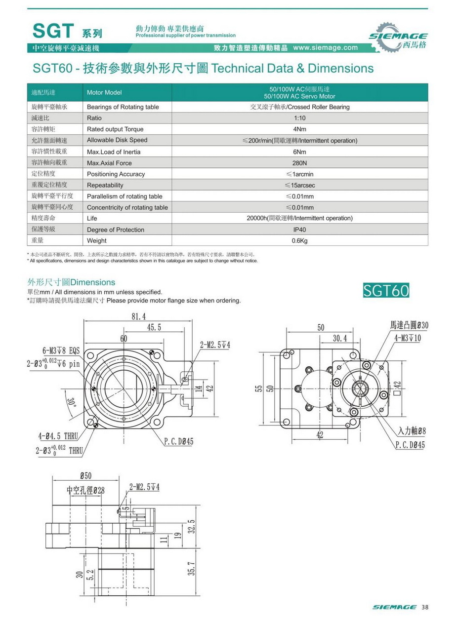 西馬格中空旋轉平臺SGT60,可配各品牌伺服電機,50/100W伺服馬達,各廠家42型步進馬達,步進電機。減速比有1:5,1:10,1:18等。