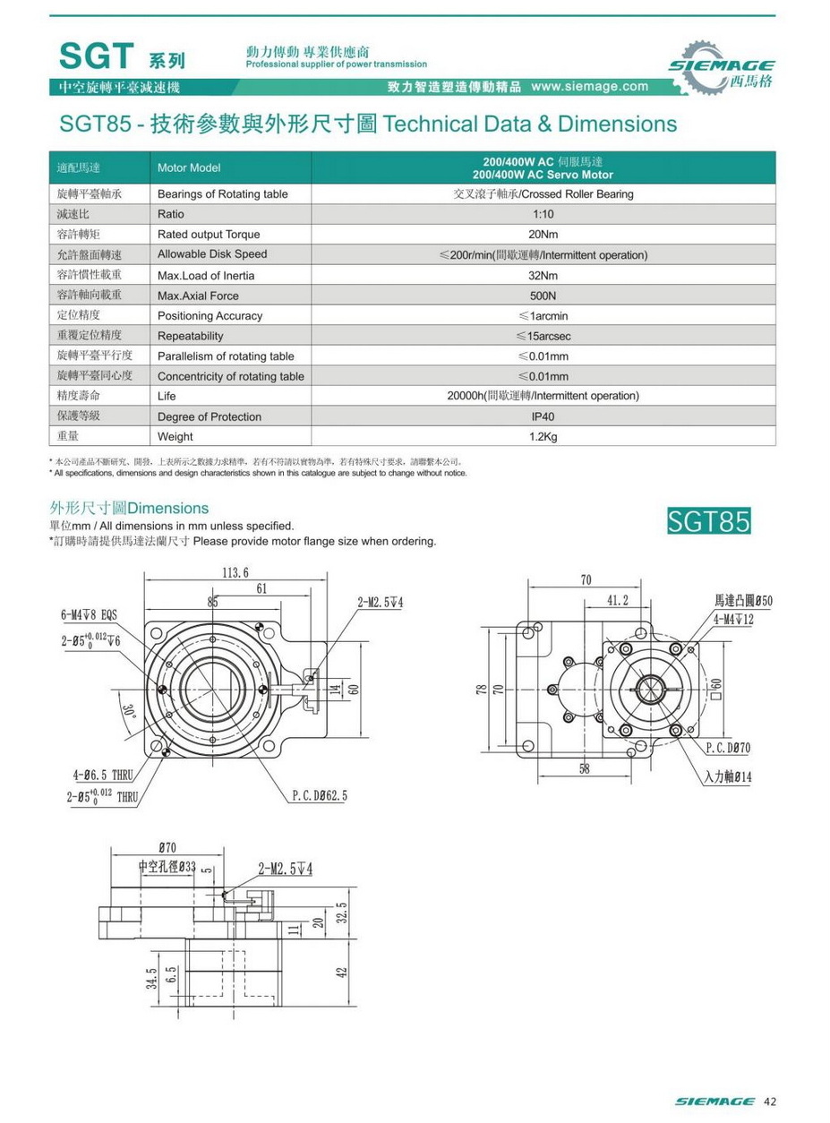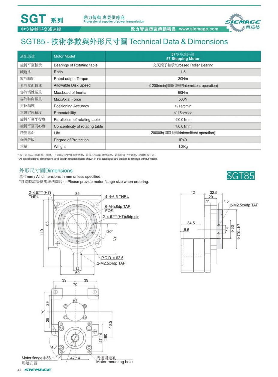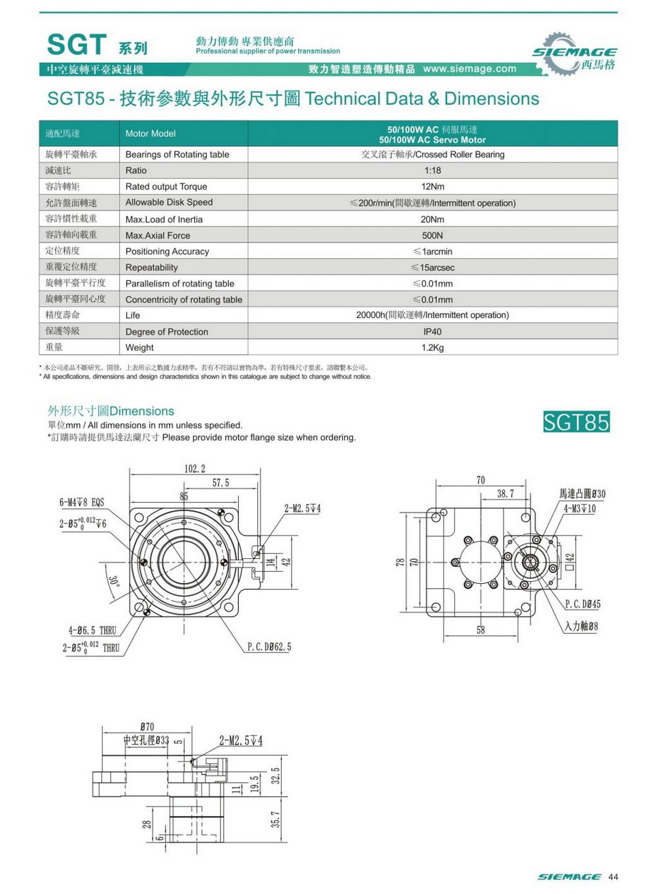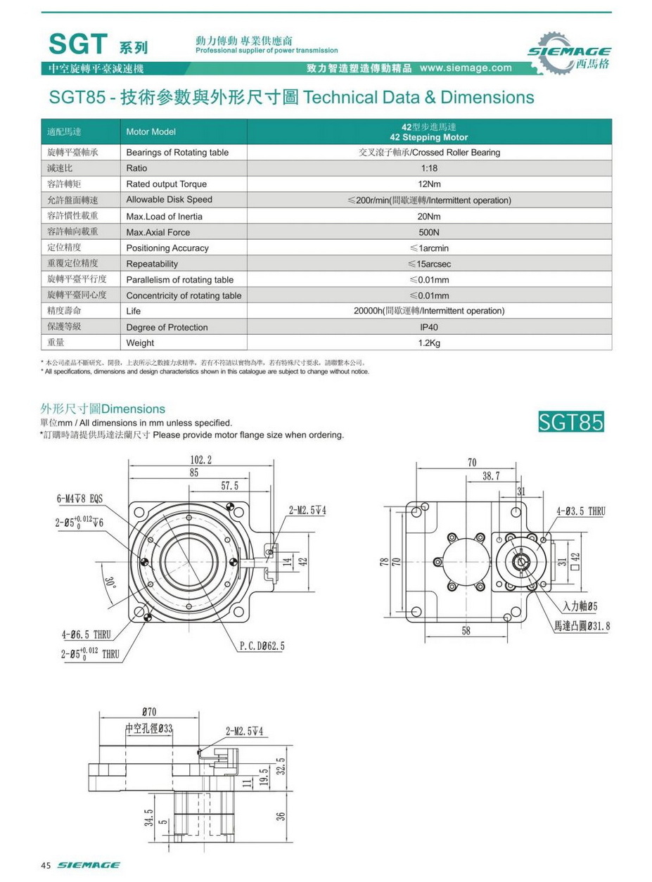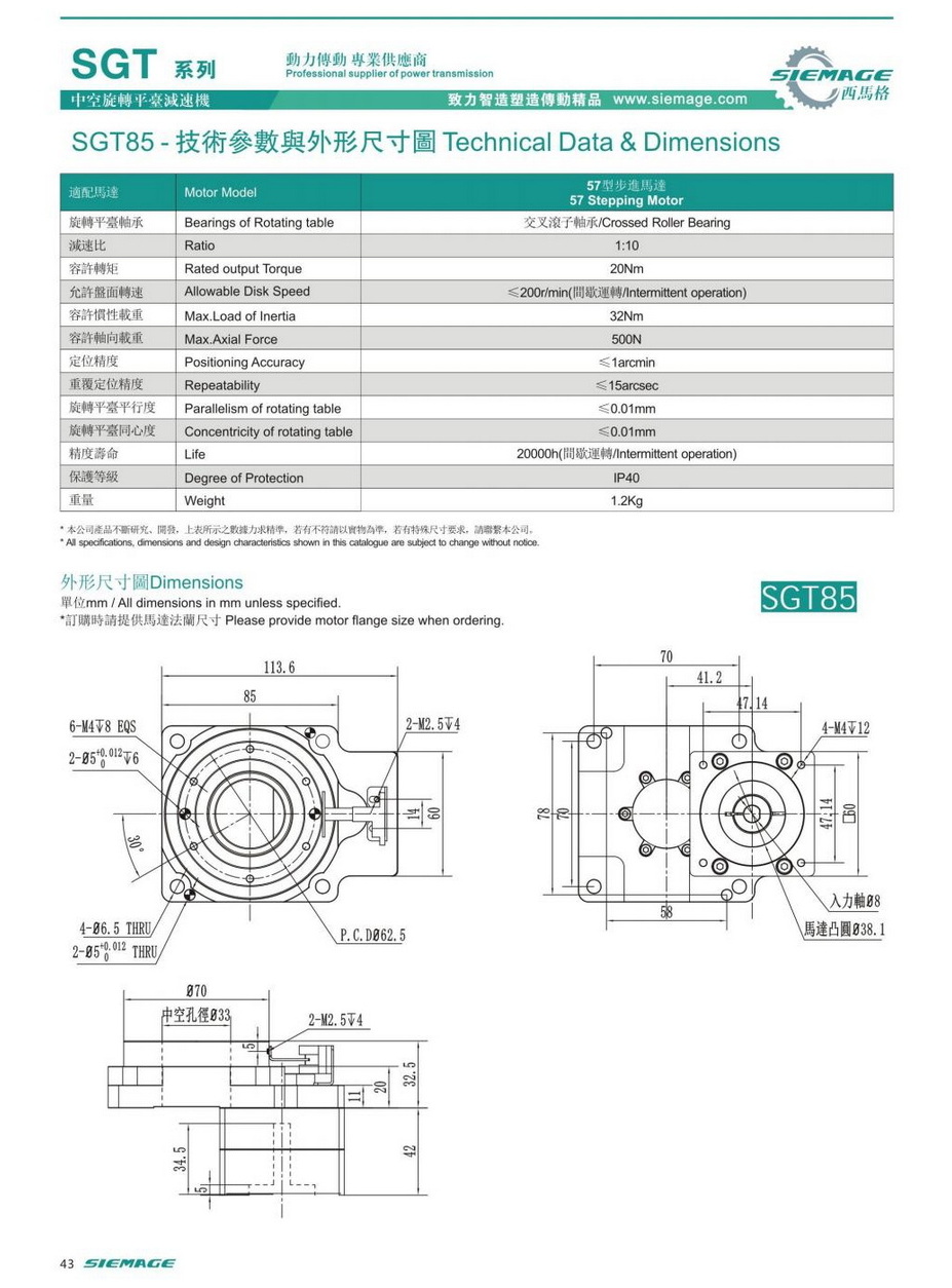 西馬格中空平臺SGT85,可配各品牌200/400W伺服電機,50/100W伺服馬達(dá),各廠家42型步進(jìn)馬達(dá),57步進(jìn)電機。減速比有1:5,1:10,1:18等。