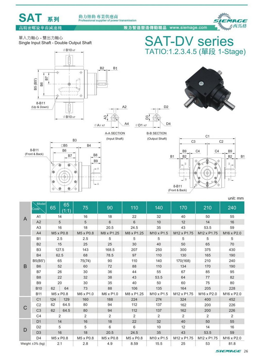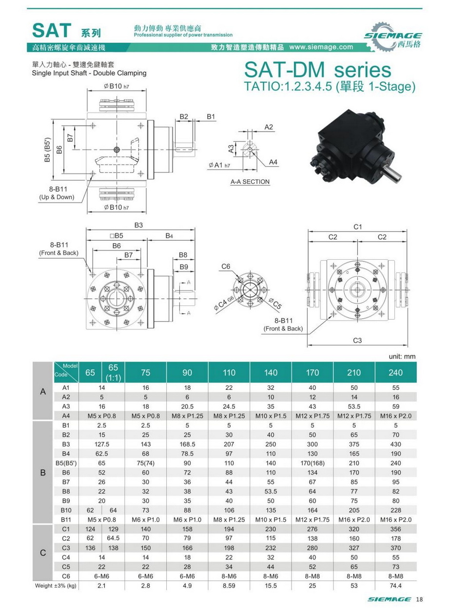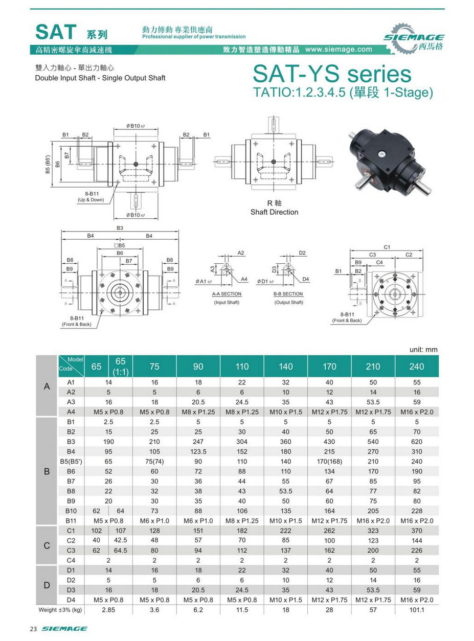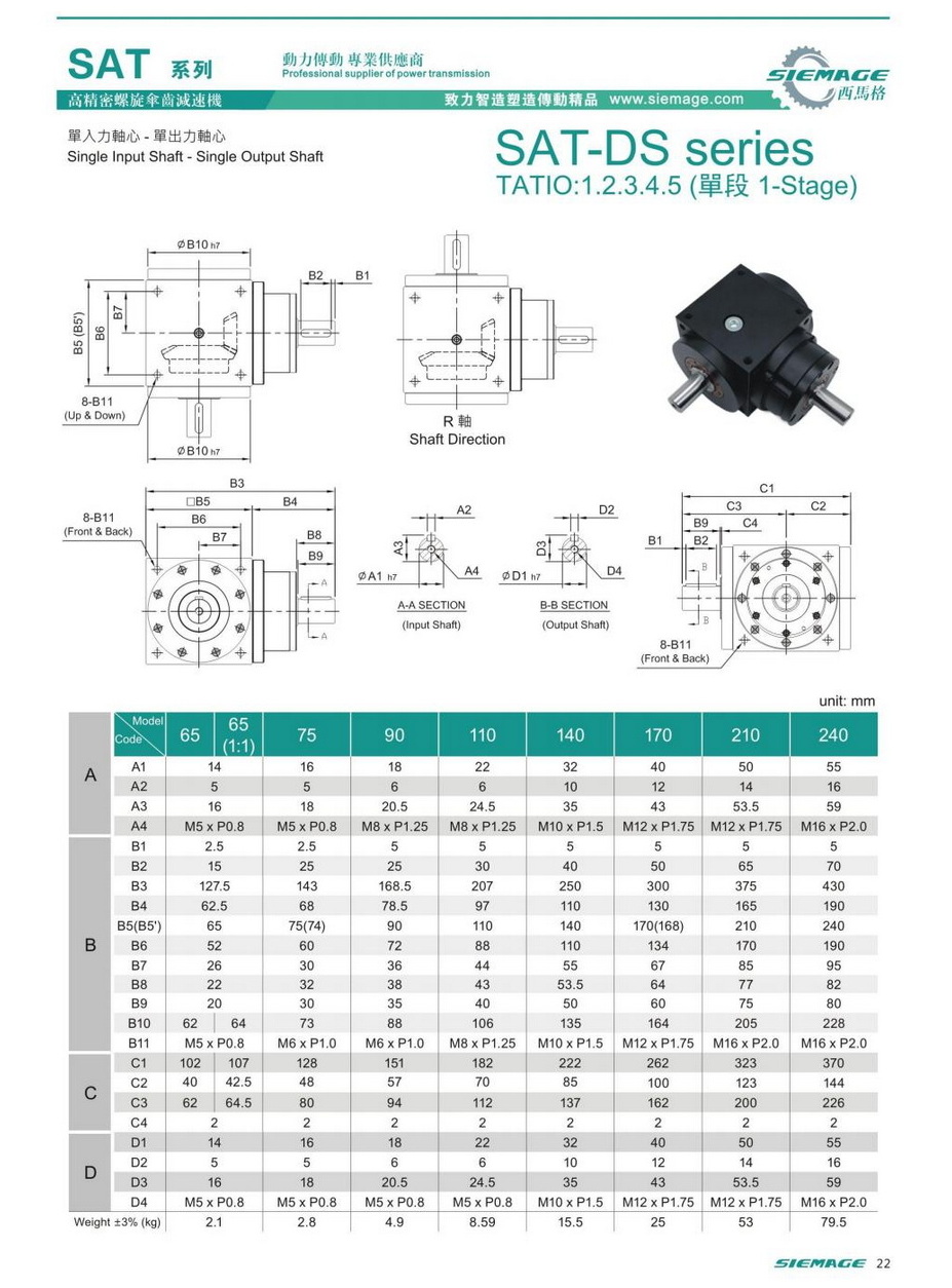 螺旋傘齒輪減速機單級的型號有SAT65,SAT75,SAT90,SAT110,SAT140,SAT170,SAT210等,減速比有1:1,1:2,1:3,1:4,1:5等入力可配各種伺服電機,步進電機,直流電機等。螺旋傘齒輪減速機雙級入力軸及出力軸均可特殊加工,訂制,滿足各種需求。