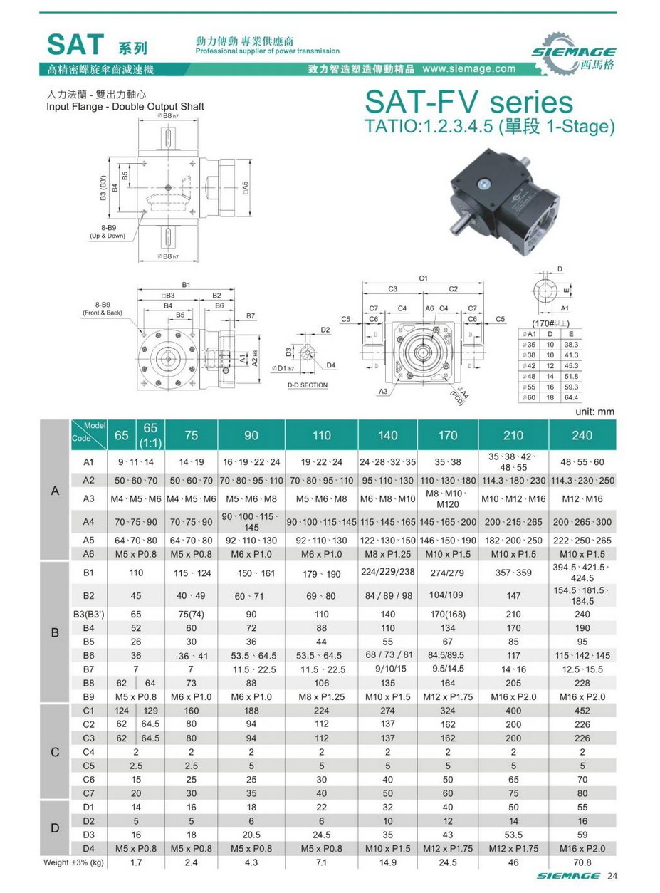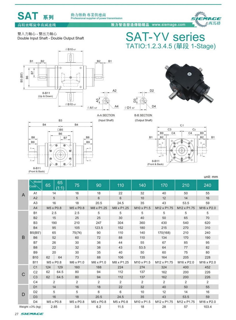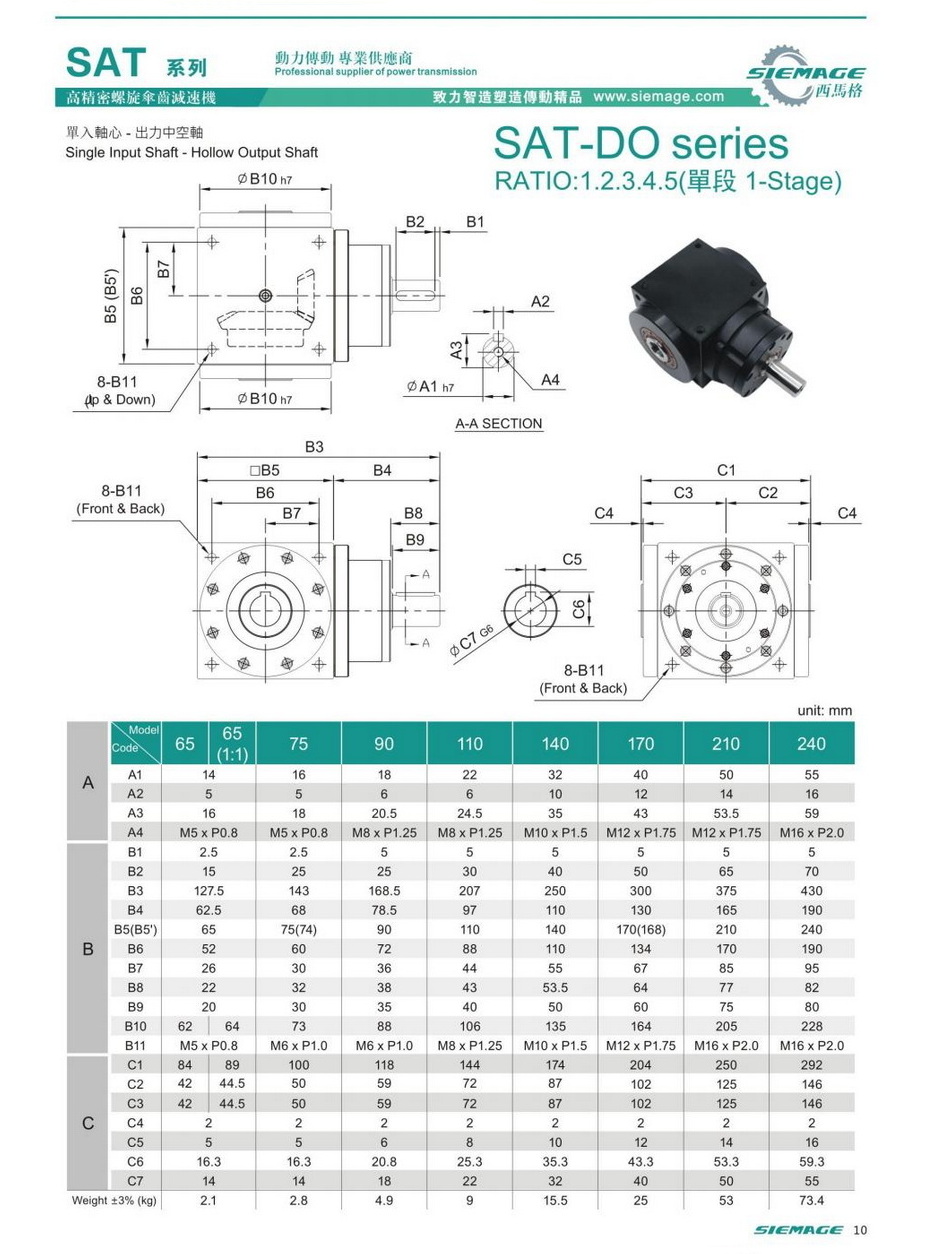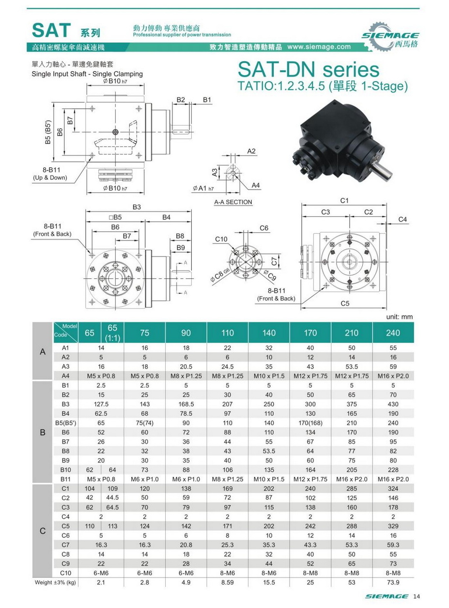 螺旋傘齒輪減速機單級的型號有SAT65,SAT75,SAT90,SAT110,SAT140,SAT170,SAT210等,減速比有1:1,1:2,1:3,1:4,1:5等入力可配各種伺服電機,步進電機,直流電機等。螺旋傘齒輪減速機雙級入力軸及出力軸均可特殊加工,訂制,滿足各種需求。