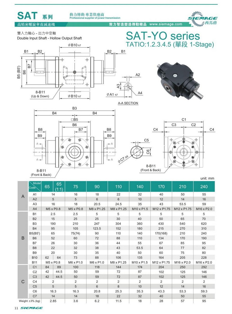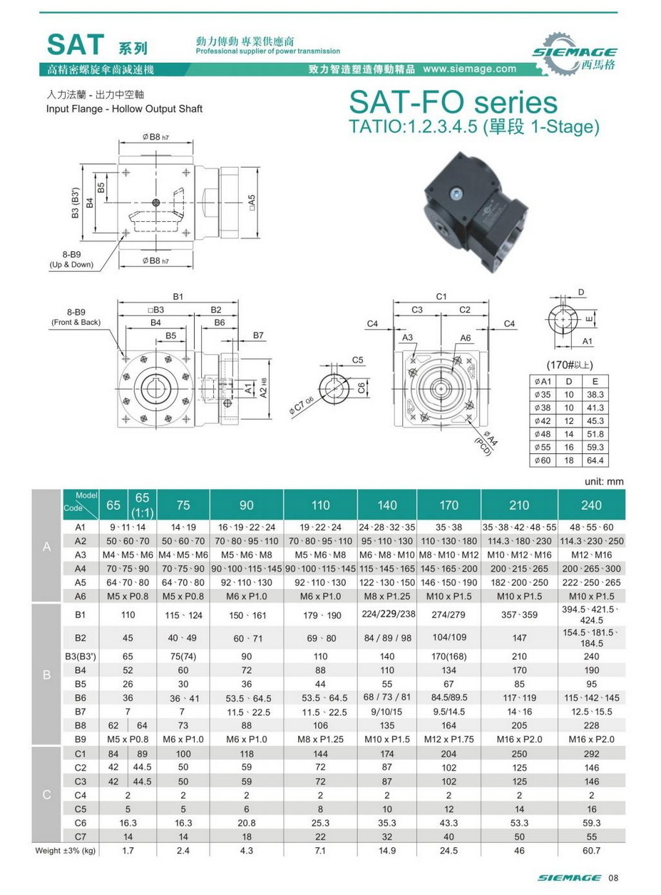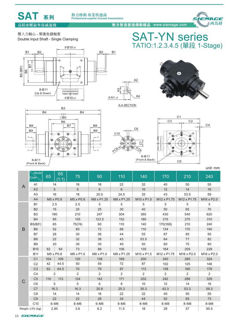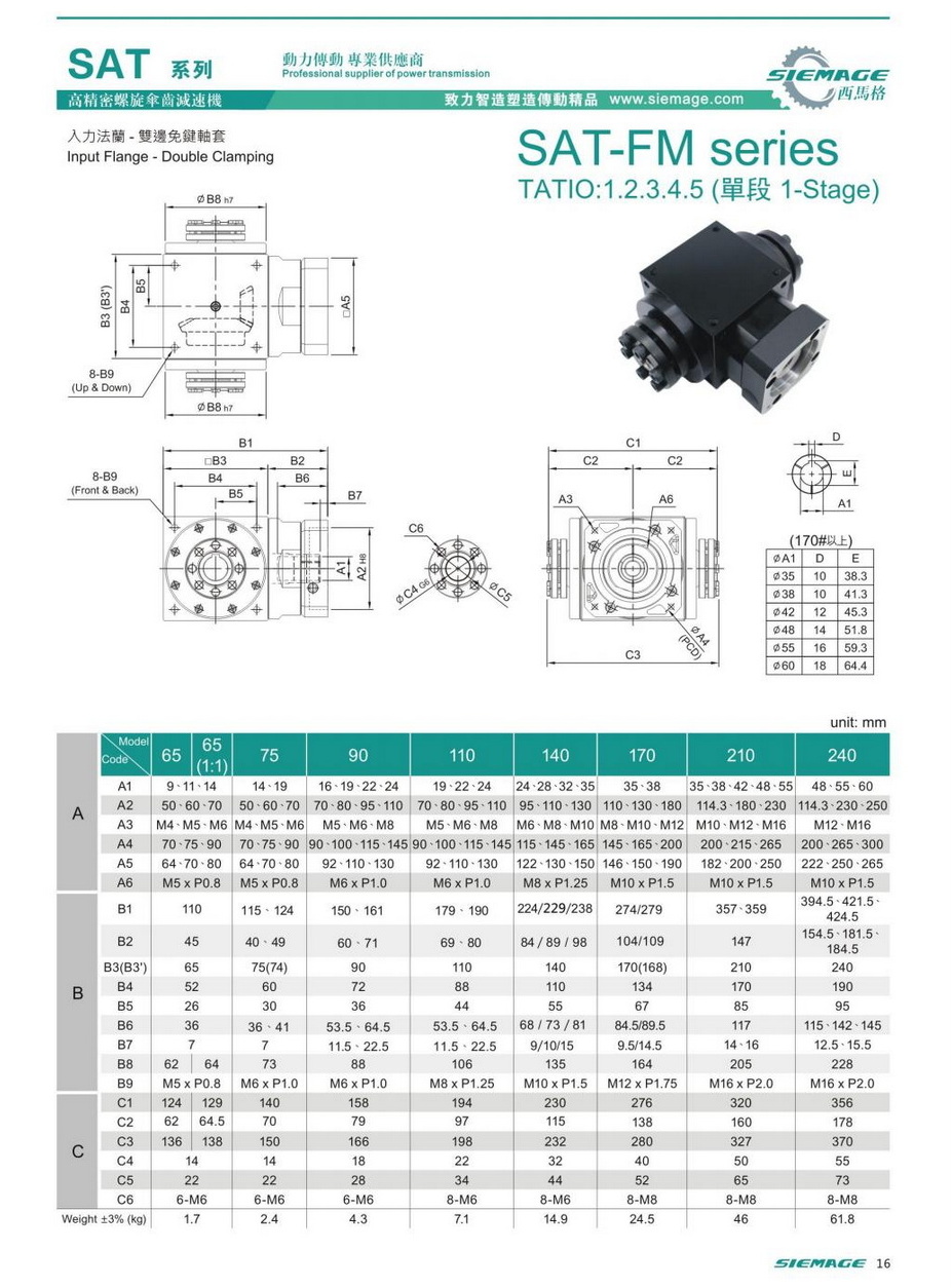 螺旋傘齒輪減速機單級的型號有SAT65,SAT75,SAT90,SAT110,SAT140,SAT170,SAT210等,減速比有1:1,1:2,1:3,1:4,1:5等入力可配各種伺服電機,步進電機,直流電機等。螺旋傘齒輪減速機雙級入力軸及出力軸均可特殊加工,訂制,滿足各種需求。